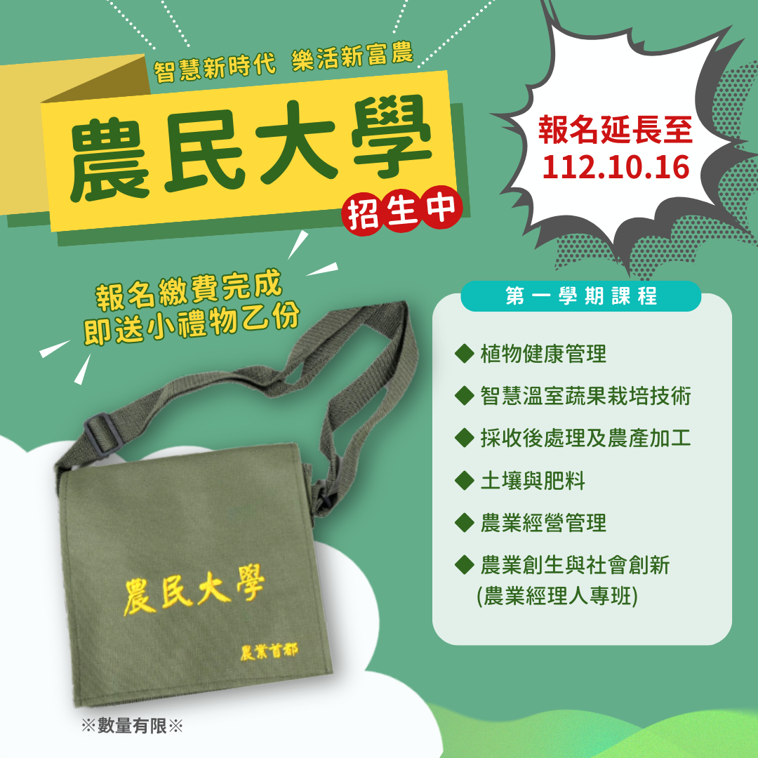 2023农民大学报名时间延长至112年10月16日(一)止,并同步调整相关期程。